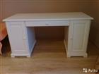 Новый письменный стол Икеа. Фасад и столешница - массив. Цвет белый. Длина 145 см, ширина 65, высота 73, ширина тумбочек 32 см.